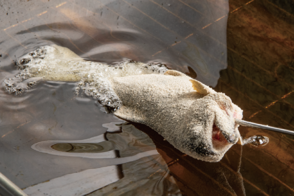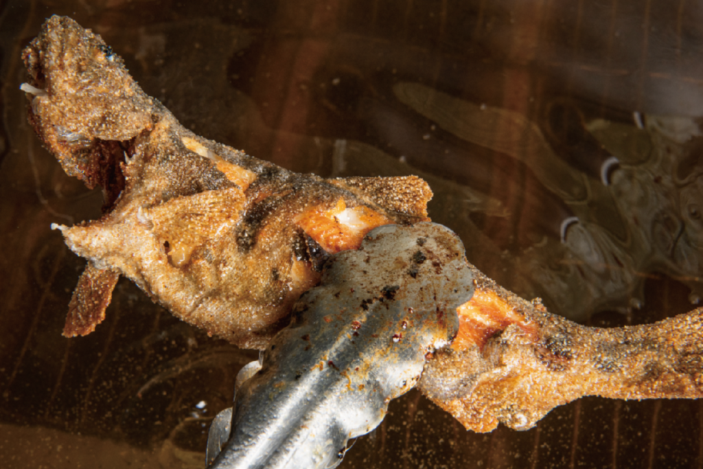 大分県・長湯の養殖場で冬~春にかけて揚げたエノハの新子は、骨が柔らかく脂がのっています。旬のエノハをまるごと唐揚げにしました。ほろっとした身がとても美味です。